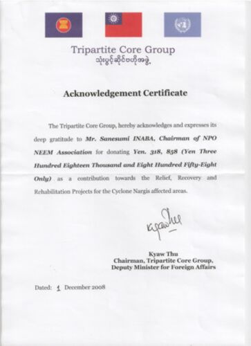 本年のスタートは、ミャンマー大使館から手紙があり、 サイクロン援助金を国連、ミャンマー政府、アセアンからなる援助調整機関 TCG(Tripartite Core Group)に送り、 それを受領した旨と、義援金を贈呈した日本ニーム協会への感謝の意を表した感謝状が送られ…